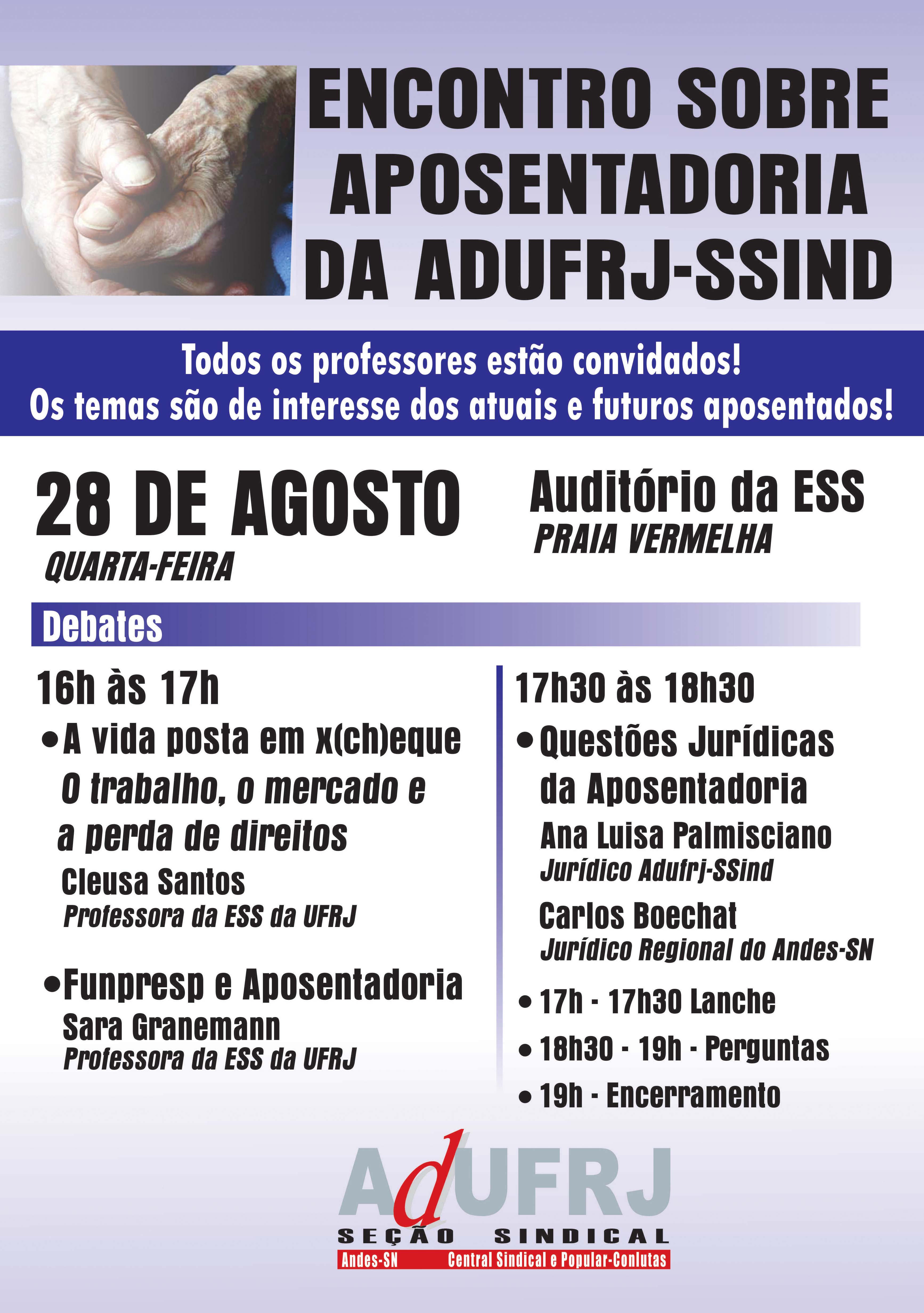 No próximo dia 28, a partir das 16h, a Escola de Serviço Social da UFRJ sedia um encontro sobre assuntos de aposentadoria. Toda a categoria está convidada para a atividade, que tratará de temas de interesse para os atuais e futuros aposentados.