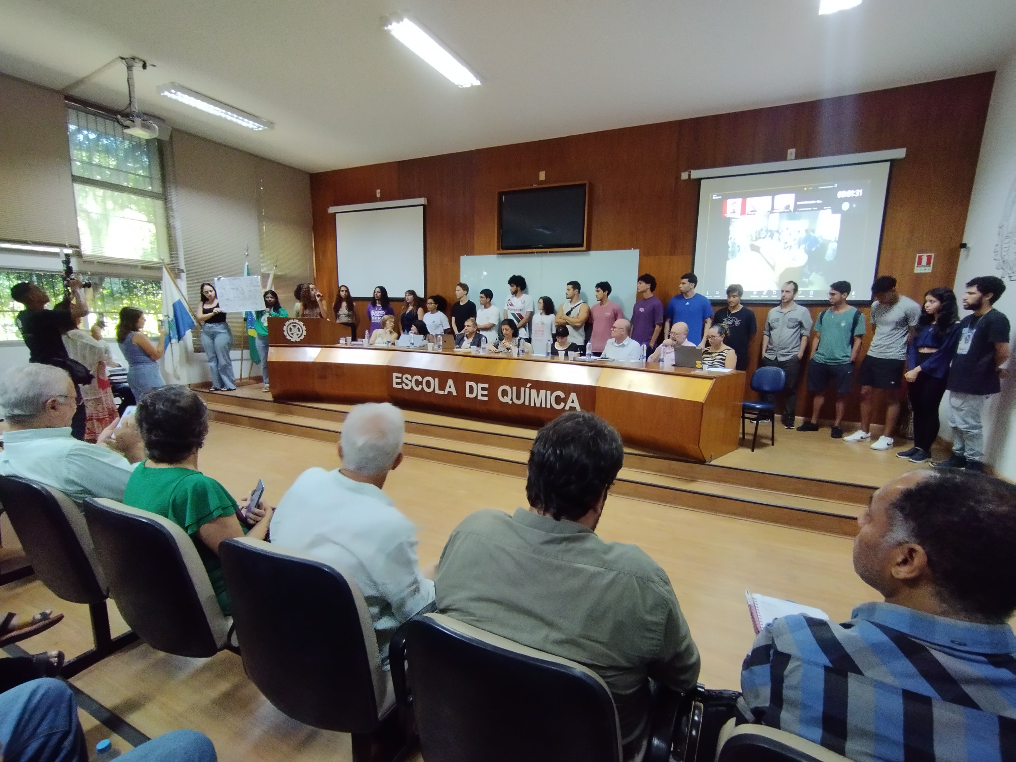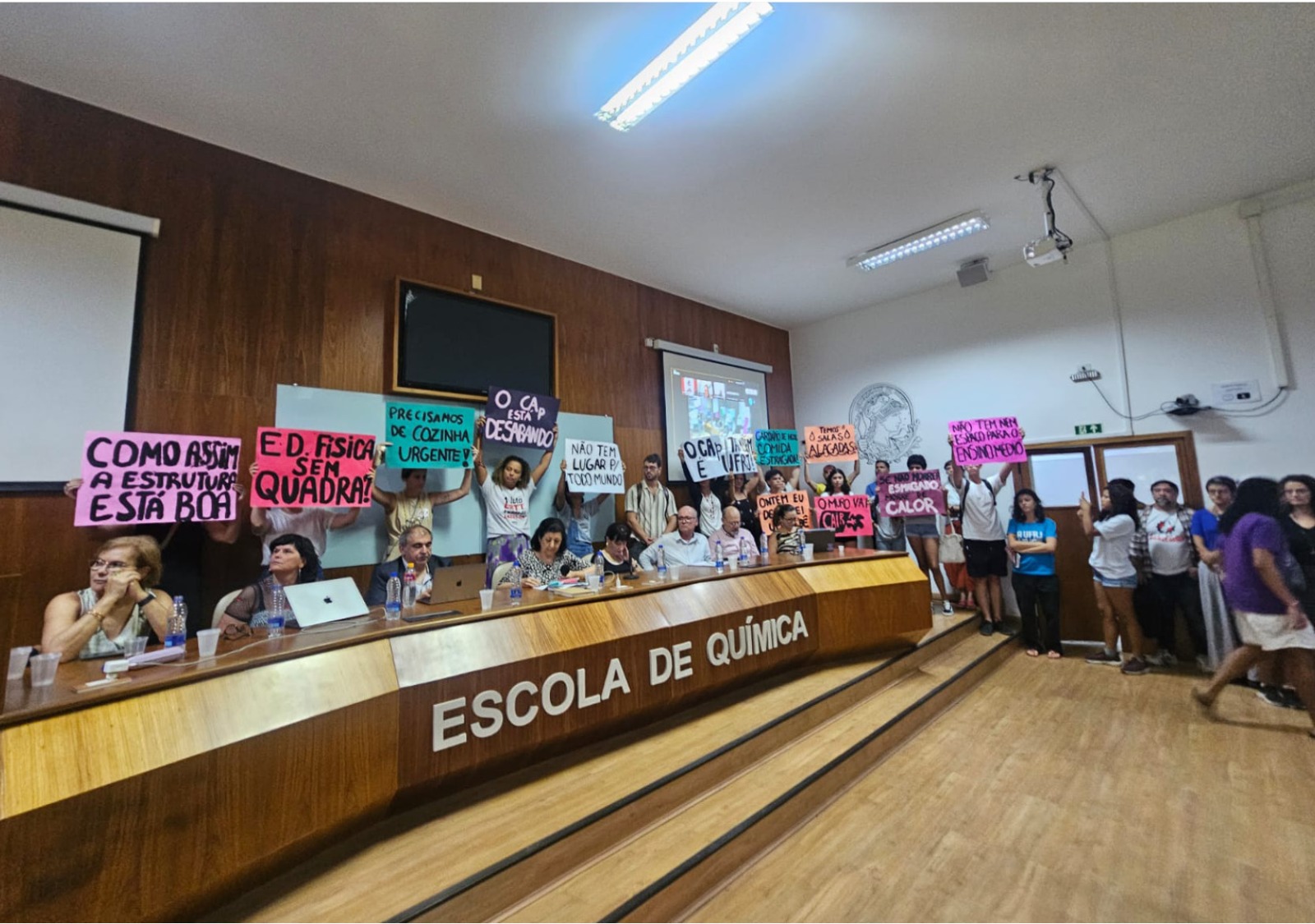“A situação do colégio está cada vez mais deplorável. A gente fica afastado, mas a gente é UFRJ”, protestou Sofia, representante do Grêmio Estudantil. “Os bebedouros da escola não comportam a demanda”, disse. “A educação infantil precisa levar galão próprio”, contou.